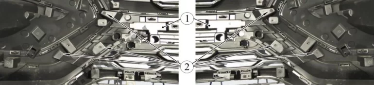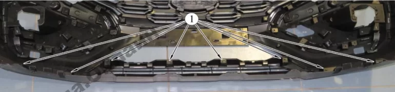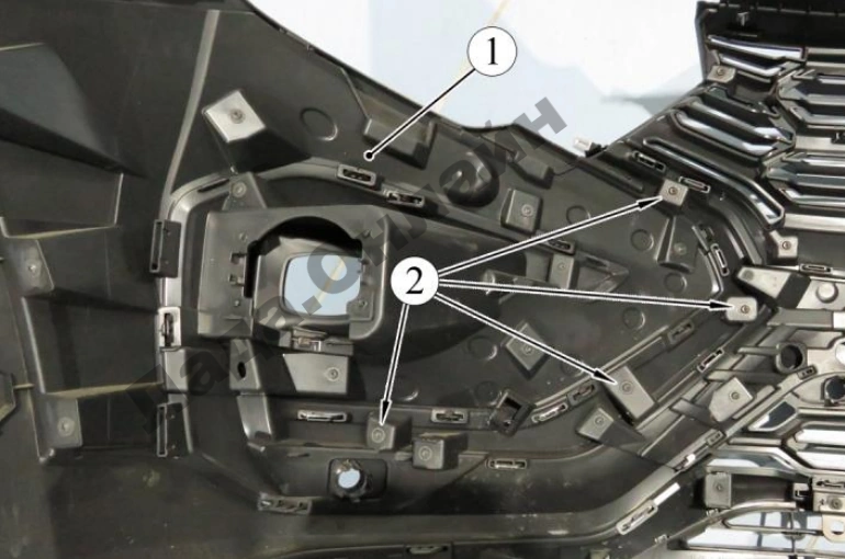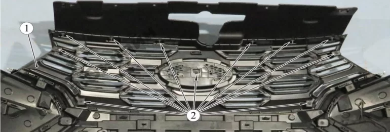 Рисунок 2-15 – Крепление облицовки решетки радиатора: 1 – бампер; 2 – винт крепления облицовки