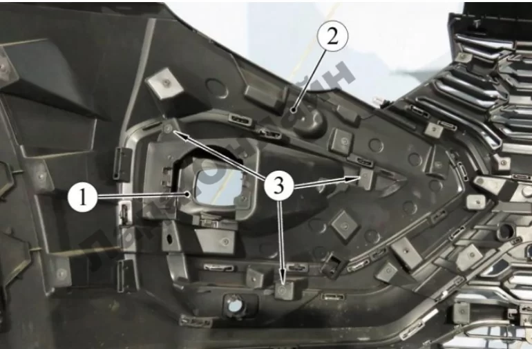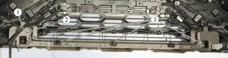 Рисунок 2-10 – Крепление энергопоглощающей вставки: 1 – жгут проводов бампера; 2 – вставка энергопоглощающая; 3 - фиксаторы вставки