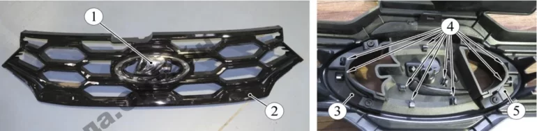 Рисунок 2-16 – Крепление логотипа: 1 – логотип; 2 – облицовка решетки радиатора; 3 – рамка внутренняя левая, 4 – фиксаторы облицовки: 5 – рамка внутренняя правая