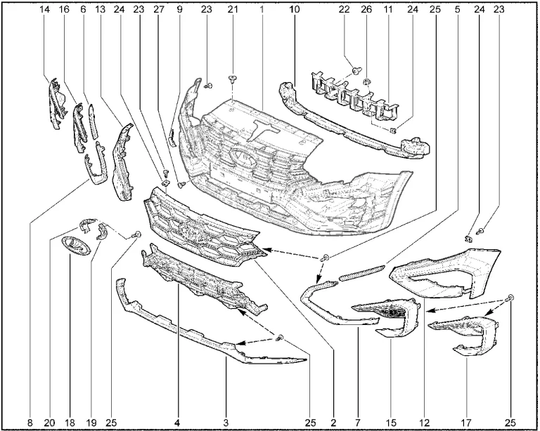 Рисунок 2-9 – Элементы переднего бампера комплектации “CROSS”: 1 – вставка переднего бампера правая; 2 – жгут проводов переднего бампера; 3 – облицовка решетки радиатора; 4 – вставка переднего бампера левая; 5 – бампер; 6 – накладка переднего бампера правая; 7 – молдинг переднего бампера правый; 8 – молдинг переднего бампера левый; 9 – накладка переднего бампера левая; 10 – фара противотуманная правая; 11 – фара противотуманная левая; 12 – кронштейн арочной зоны правый; 13 – кронштейн арочной зоны левый; 14 – решетка радиатора нижняя; 15 – датчик парковки; 16 – накладка переднего бампера нижняя; 16 – накладка переднего бампера нижняя; 17 – вставка энэргопоглощающая переднего бампера