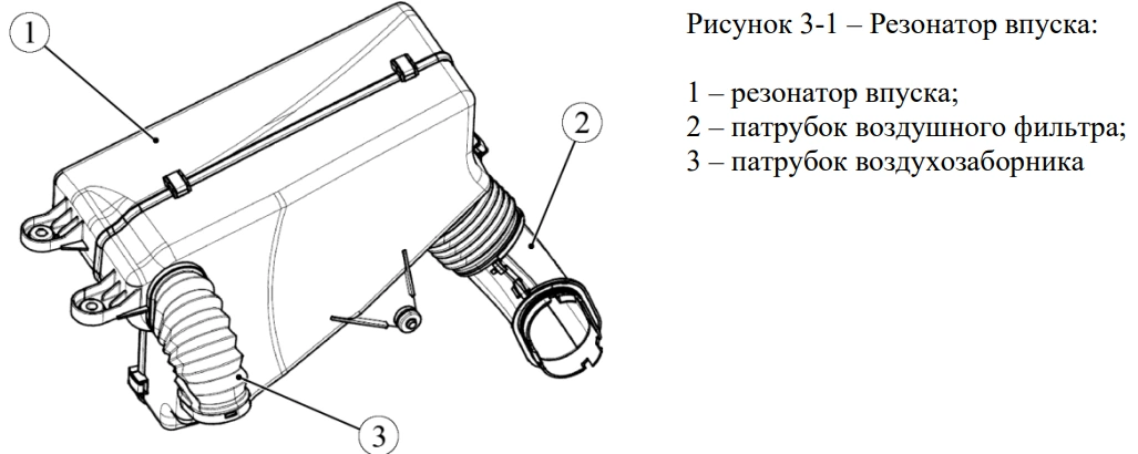 Отсоединить патрубки резонатора 1, рисунок 3-1, впуска от воздухозаборника и корпуса воздушного фильтра, отвернуть два винта крепления и снять резонатор (отвертка крестообразная).