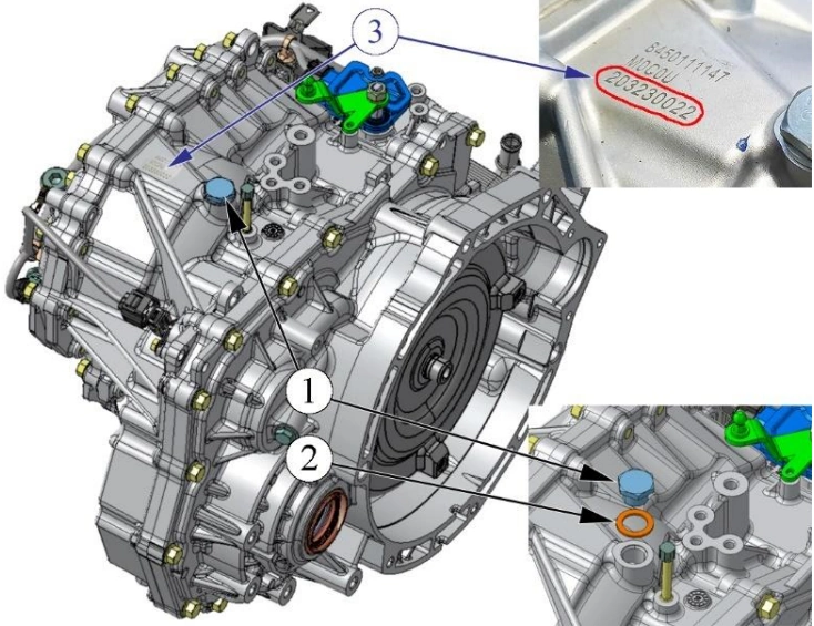 Рисунок 4-6 – Доливка масла: 1 – пробка отверстия для заливки масла; 2 – уплотнительное кольцо; 3 – номер КП