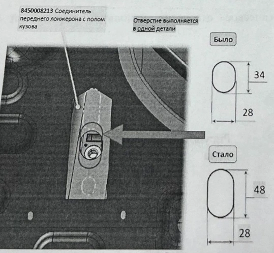 Для улучшения доступа в зону ремонта — допускается увеличить размер овального отверстия в соединителе переднего лонжерона.