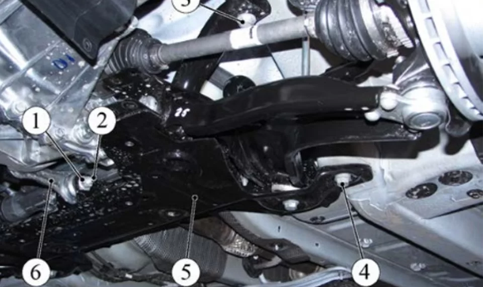При демонтаже подрамника, случае невозможности отвернуть болт (проворачивание гайки), срезать шляпку болта для обеспечения демонтажа подрамника.