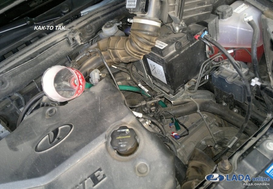 Доливать масло в КПП удобно через желтую заглушку. Необходимо снять только воздушный резонатор (для Lada Vesta/XRAY). Сама заглушка крепится на одном болте с головкой TorX, который можно открутить и обычной головкой (автор фото):