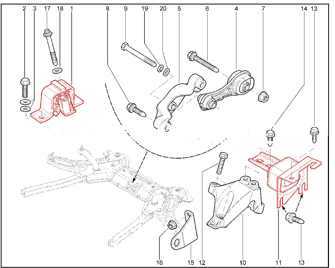 6. Заглушите двигатель и протяните оба болта крепления правой опоры двигателя к лонжерону моментом примерно 70 нМ.