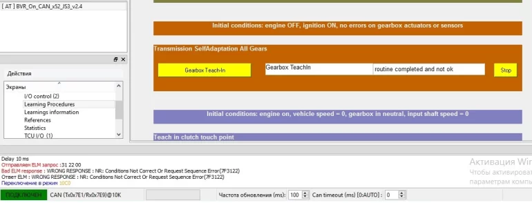 При самостоятельной попытке провести обучение Роботизированной КПП (переключение передач) сканер ELM выдаёт ответ "Сonditions not correct or request sequence error (7F3122)". При обучении выжима сцепления такого ответа не выдаёт.