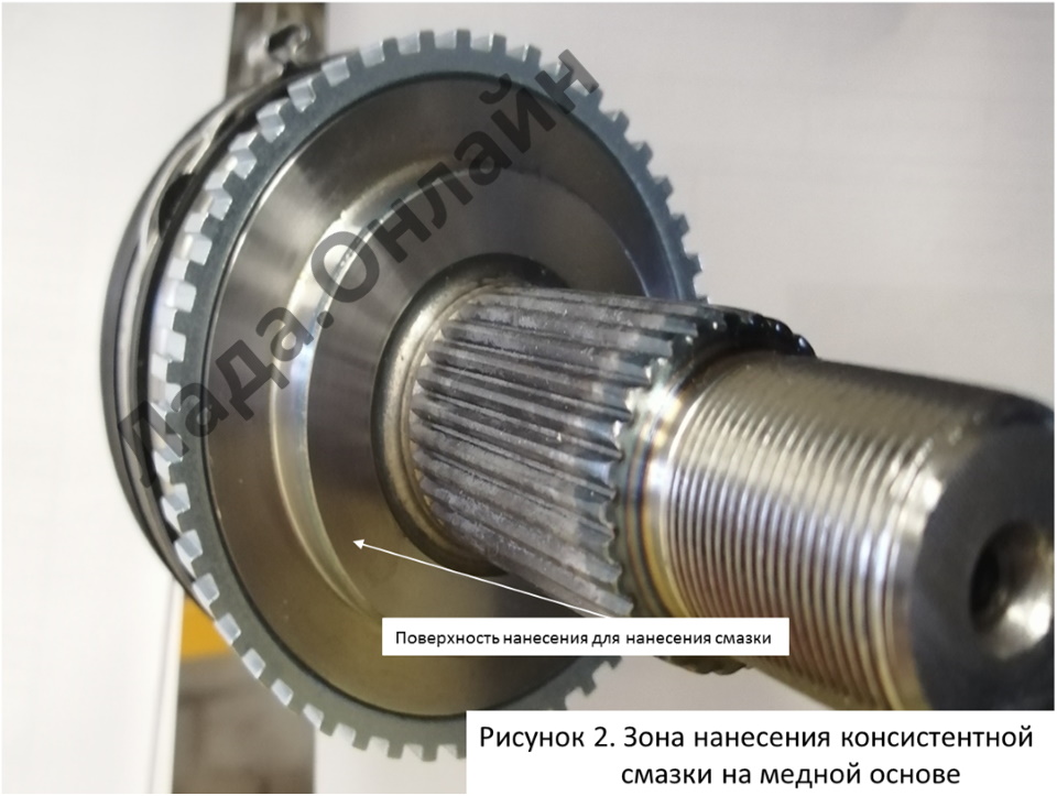10. Нанесите консистентную смазку на медной основе на торец корпуса наружного шарнира см. рис. 2 (место контакта шарнира равных угловых скоростей и ступицы).