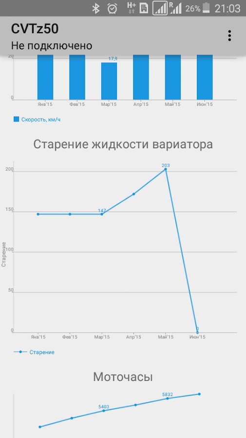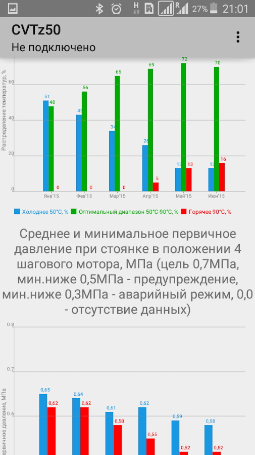 - Отображение помесячной статистики температурного режима вариатора, давлений при определенных условиях, случаев неудавшегося переключения передач, пробега, расхода топлива, и динамики старения жидкости вариатора