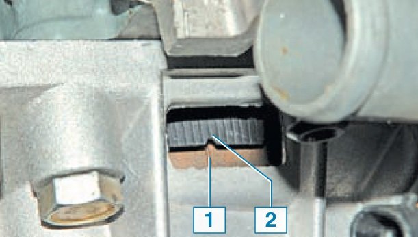 Перед установкой роликов следует на резьбовую часть нанести резьбовой герметик. Болт натяжного ролика окончательно не затягиваем. Перед установкой ремня ГРМ проверяем совмещение установочных меток. Положение коленвала удобно контролировать по совмещению метки 1 на зубчатом шкиве коленвала с меткой 2 (ребро) на крышке масляного насоса.
