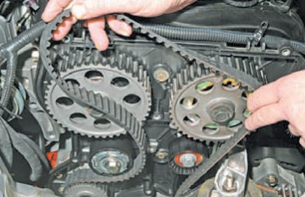 Надеваем ремень ГРМ на шкив коленвала, натягивая обе ветви ремня, заводим переднюю ветвь за опорный ролик, а заднюю, надев на шкив насоса охлаждающей жидкости, — за натяжной ролик. Затем надеваем ремень ГРМ на шкивы распредвалов.