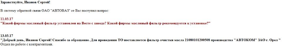 На вопрос: Какой фирмы масляный фильтр установлен на Весте с завода? Какой фирмы масляный фильтр рекомендуется к установке?