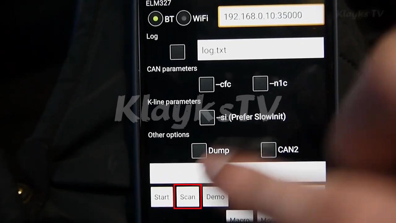 - При первом запуске программы выставить настройки (как на фото) и нажать Scan, затем OBDII (шрифт можно увеличить клавишей увеличения громкости).