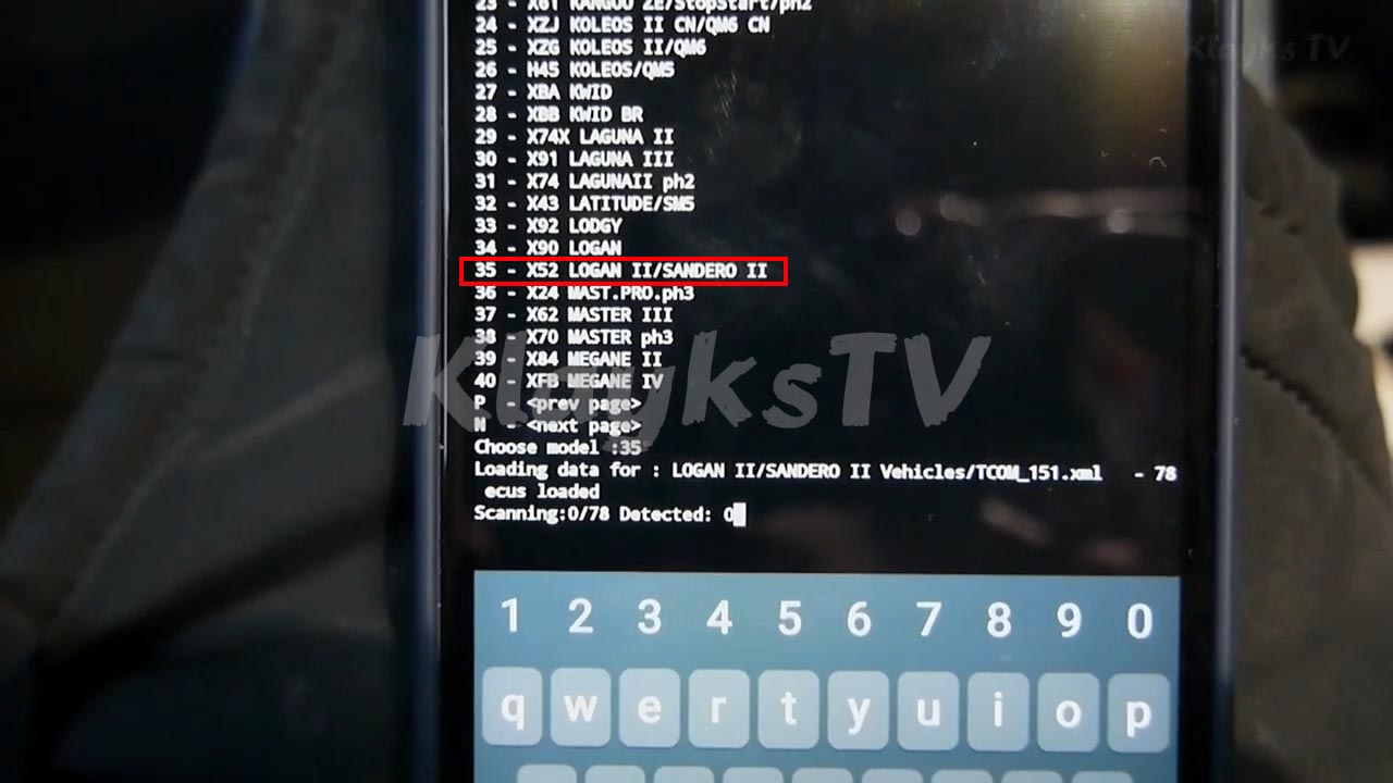 - На второй странице выбрать модель 35 - Logan II, Sandero II (это для Lada Vesta и XRAY). Ждем когда просканирует электронные блоки.
