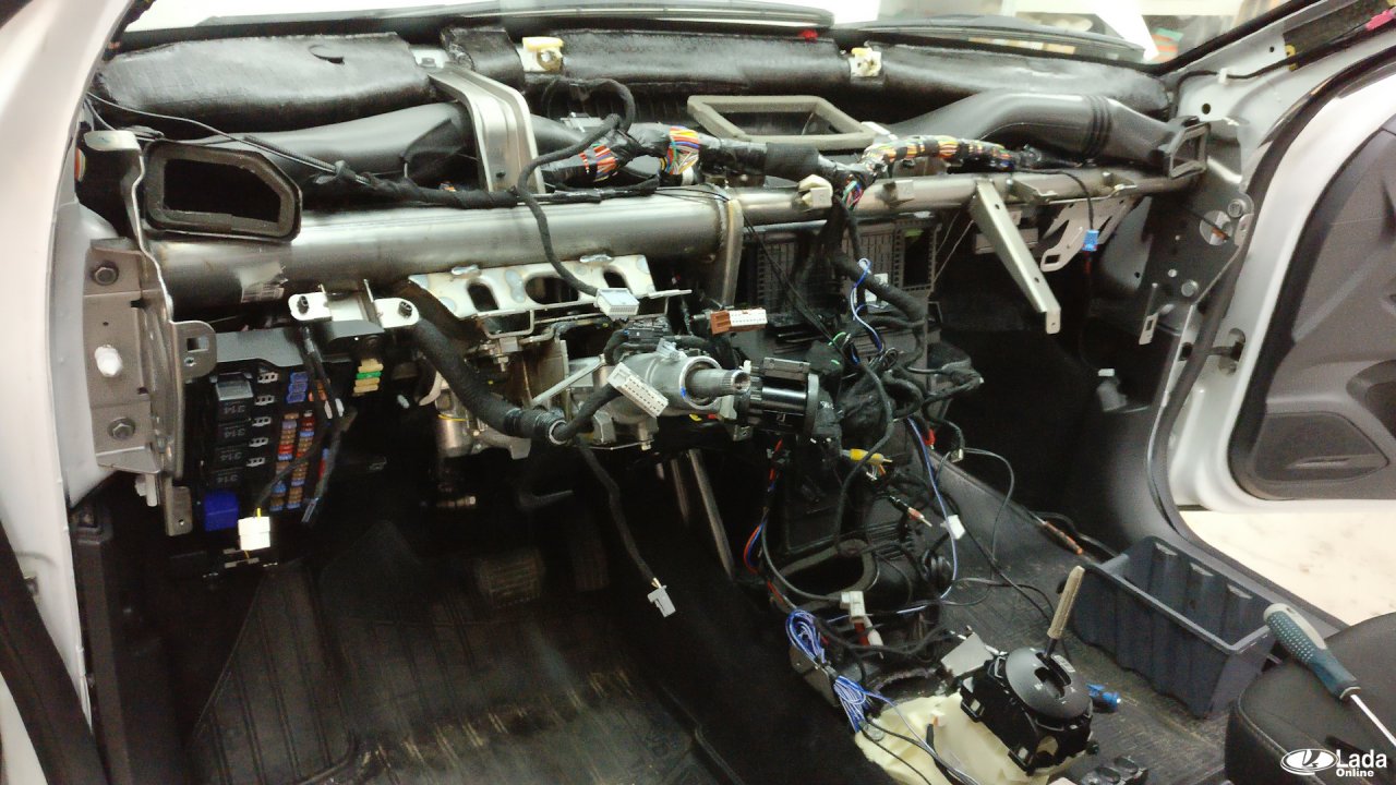 Модуль панели приборов на Весте - это узел, который состоит из поперечины, жгута проводов с монтажным блоком в сборе, блока печки/кондиционера/вентиляции, каркаса в сборе с дефлекторами, воздуховодами и комбинацией приборов. Рассмотрим инструкцию по снятию и разборке данного модуля.