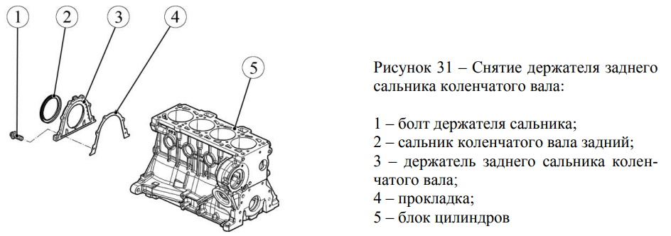 Отвернуть шесть болтов 1, рисунок 31, снять держатель 3 заднего сальника коленчатого вала с сальником 2 в сборе и прокладку 4 (головка сменная Torx E8, вороток, удлинитель).
