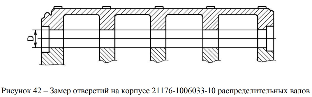 Проверить диаметр D, рисунок 42, отверстий на корпусе подшипников распределительных валов 21176-1006033-10. Диаметр отверстий под распределительные валы должен быть 24,000…24,021 мм (нутромер типа НИ 18-50-1).