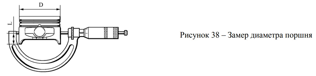 Наружный диаметр D, рисунок 38, поршня, замеренный на расстоянии L = 10 мм от нижнего края юбки поршня в плоскости перпендикулярной оси поршневого пальца, должен соответствовать классу диаметра поршня в соответствии с таблицей 6 (микрометр типа МК 100-1).