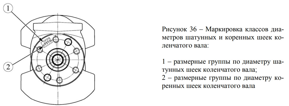 Маркировка классов шеек слева направо содержит информацию соответственно их порядковому номеру (начало отсчета со стороны привода ГРМ). Класс шатунных шеек маркируется в верхней строке, класс коренных шеек в нижней строке.
