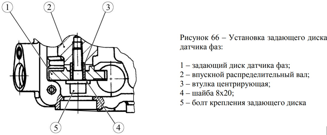 Установить задающий диск 1, рисунок 66, датчика фаз на впускной распределительный вал 2, совместив выступы на диске с пазом на торце вала. Установить центрирующую втулку 3 через отверстие диска в посадочное отверстие на торце распределительного вала. Установить болт 5 с шайбой 4 крепления задающего диска. Удерживая впускной распределительный вал ключом за лыски на хвостовике вала затянуть болт крепления задающего диска моментом 20…25 Н∙м (2,0…2,5 кгс∙м) (ключ гаечный 17, насадка под внутренний шестигранник 6 мм, вороток, ключ моментный).