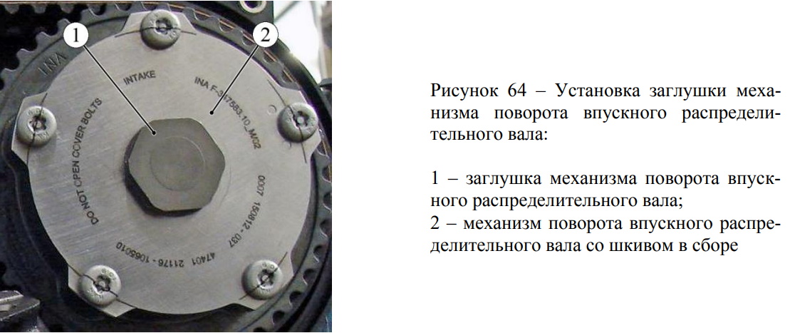 Установить заглушку 1, рисунок 64, механизма поворота впускного распределительного вала. Затянуть заглушку моментом 25…35 Н∙м (2,5…3,5 кгс∙м), удерживая впускной распределительный вал гаечным ключом за лыски на хвостовике вала (ключ гаечный 17, головка сменная 30, вороток, ключ моментный).