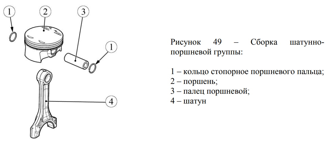 Установить стопорное кольцо 1, рисунок 49, поршневого пальца в кольцевую канавку отверстия бобышки поршня 2. Смазать отверстия в бобышках поршня и отверстие во втулке верхней головки шатуна моторным маслом. Установить поршневой палец 3 в поршень 2 и шатун 4.