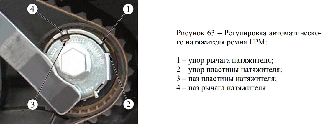 Повернуть коленчатый вал на два оборота за болт крепления демпфера, проверить совпадение меток. При отклонении паза 3, рисунок 63, за пределы паза 4 выполнить повторное натяжение ремня, предварительно отвернув болт крепления автоматического натяжителя на 45°…90° (ключ гаечный кольцевой 15, 17, головка сменная 15, 17, вороток).