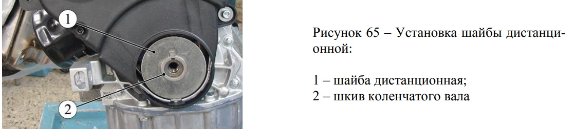 Установить шайбу 1, рисунок 65, дистанционную на шкив 2 коленчатого вала.