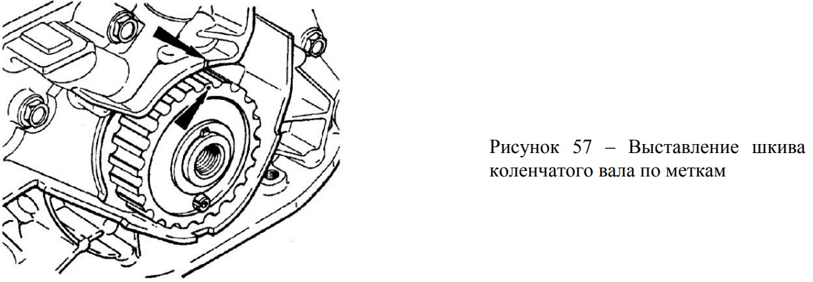 Совместить установочную метку шкива коленчатого вала с меткой на крышке масляного насоса, как показано на рисунке 57, поворотом коленчатого вала в кратчайшем угловом направлении за болт крепления демпфера (ключ гаечный кольцевой 17).
