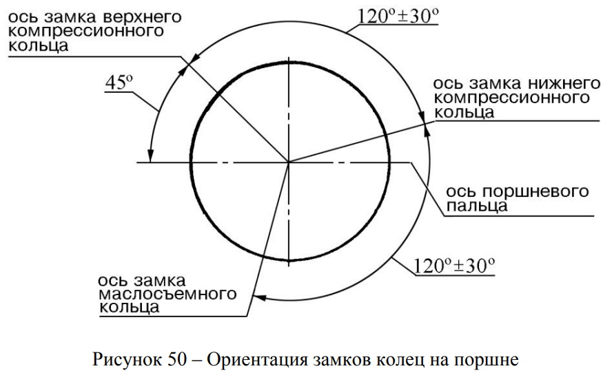 Ориентация замков поршневых колец показана на рисунке 50 (клещи для снятия и установки поршневых колец).