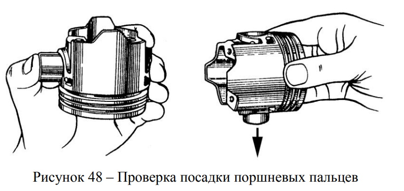Проверить посадку поршневых пальцев в отверстиях бобышек поршней. Поршневой палец, смазанный моторным маслом, должен входить в отверстие поршня от нажатия большого пальца руки и плавно выходить под собственным весом из отверстий бобышек поршня, находясь в вертикальном положении, как показано на рисунке 48. Если для выхода поршневого пальца из отверстий бобышек поршня требуется приложение дополнительных усилий, заменить сопрягаемые детали.