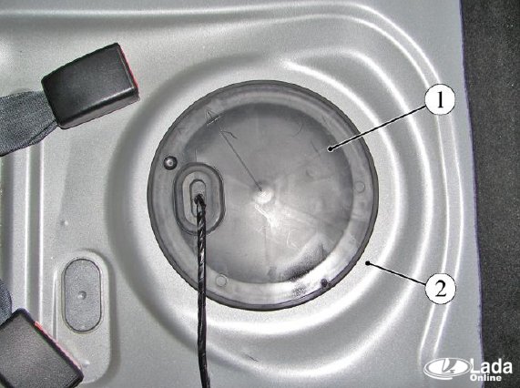 В первую очередь проверяем исправность реле и предохранителей бензонасоса в монтажном блоке. Затем выключаем зажигание. Поднимаем задний диван, отщелкиваем крышку (Рис1 №1) и отсоединяем от бензонасоса колодку с проводами (Рис2 №1), нажимая на фиксатор.
