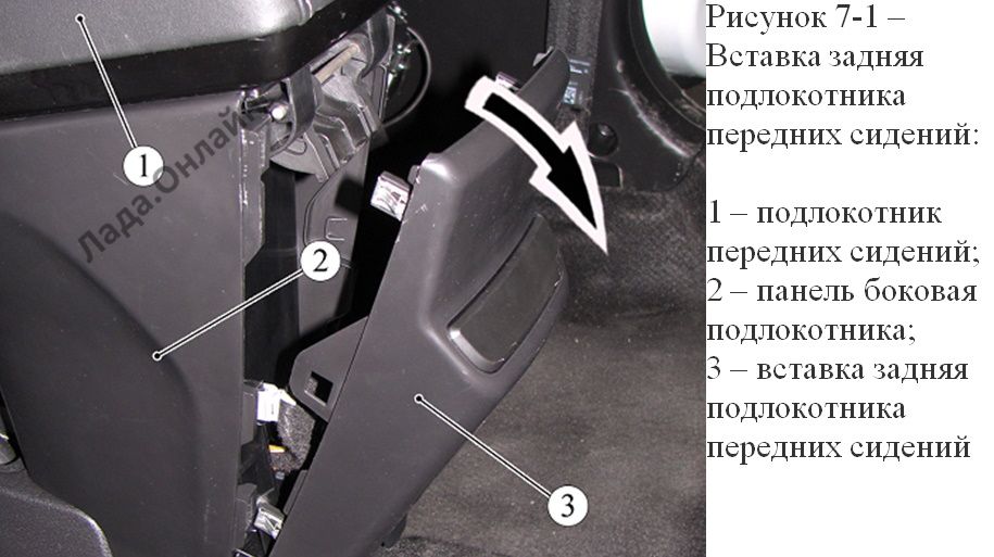 В стык между боковой панелью 2, рисунок 7-1, и задней вставкой 3 подлокотника 1 вставить приспособление, и отжимными движениями снять вставку, отсоединив, колодку жгута проводов от розетки, расположенной на вставке (приспособление для демонтажа декоративных элементов кузова или отвертка плоская с защищенным жалом).