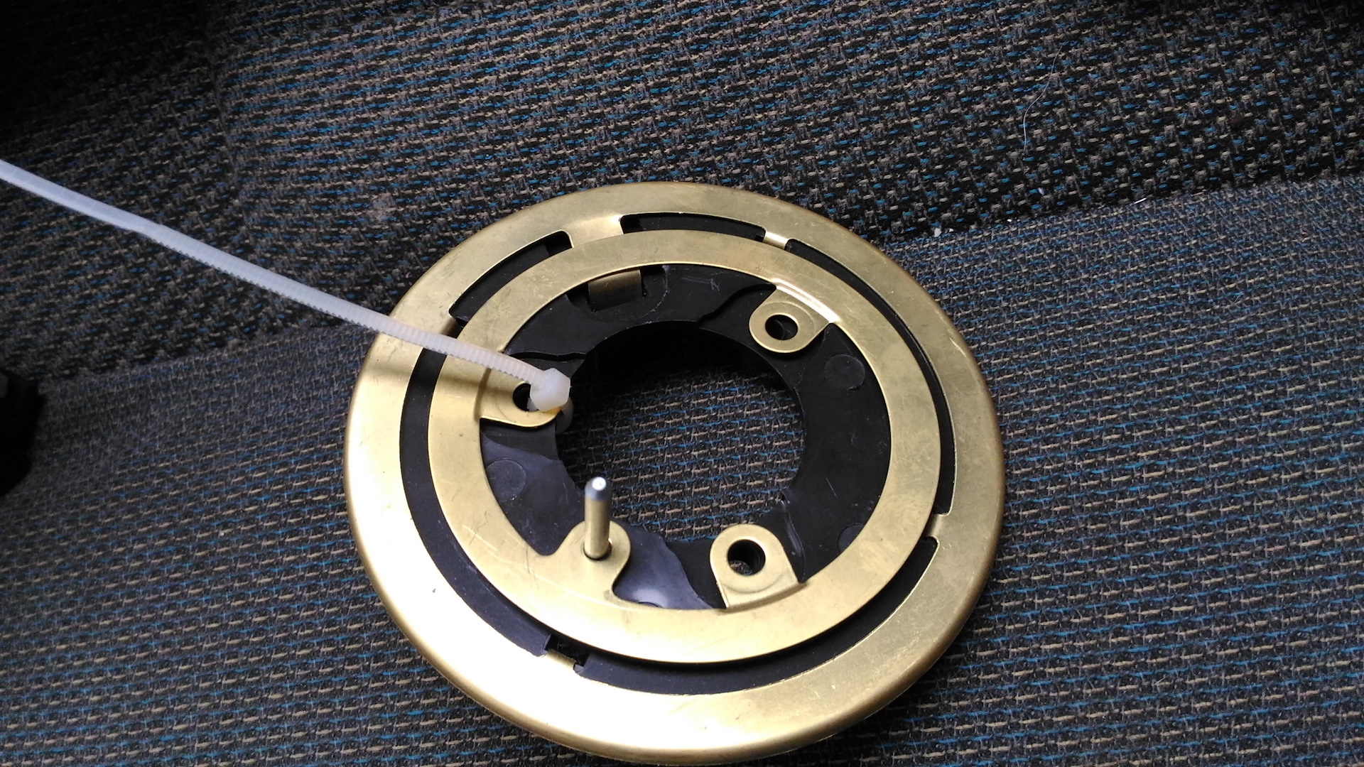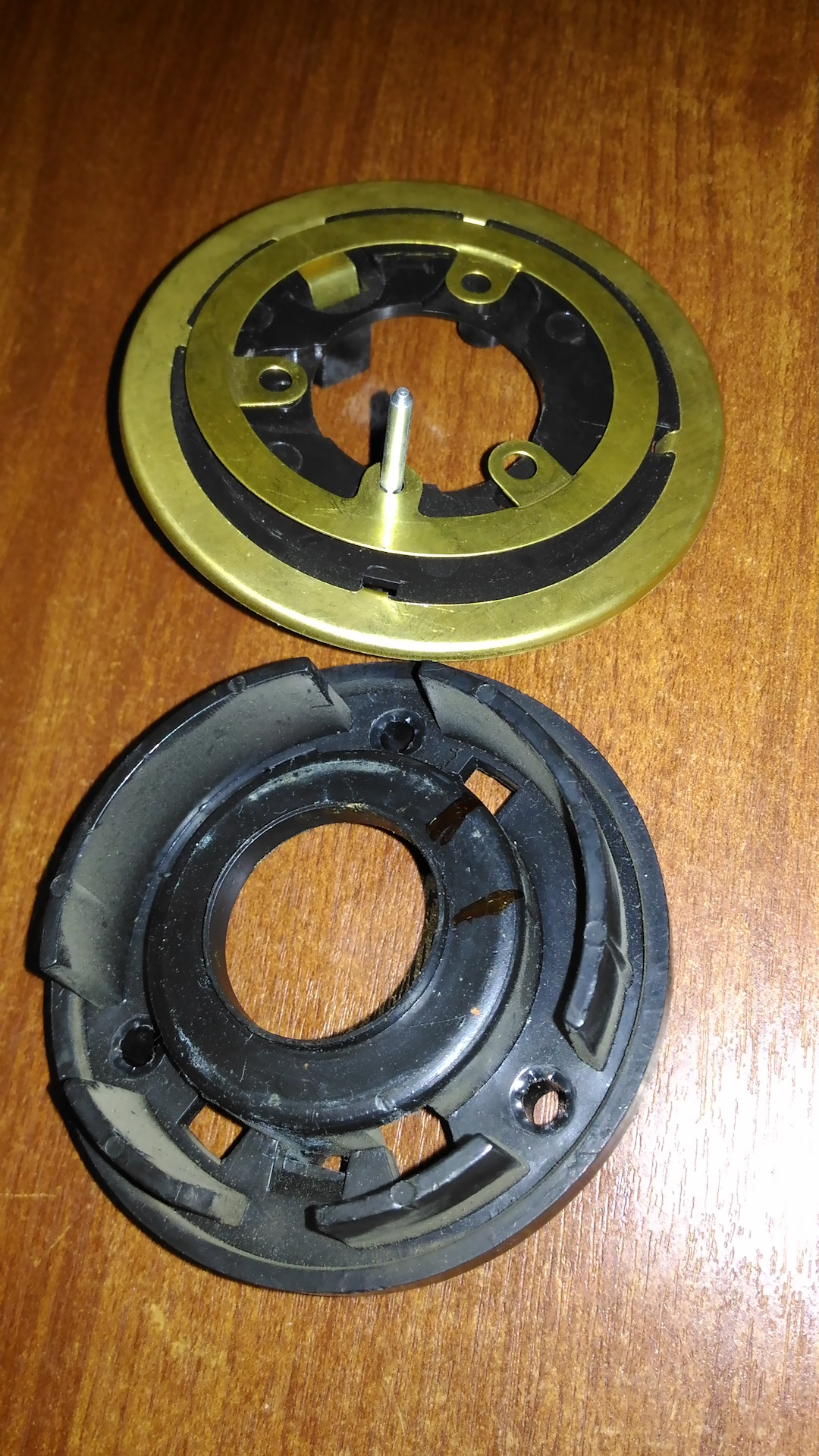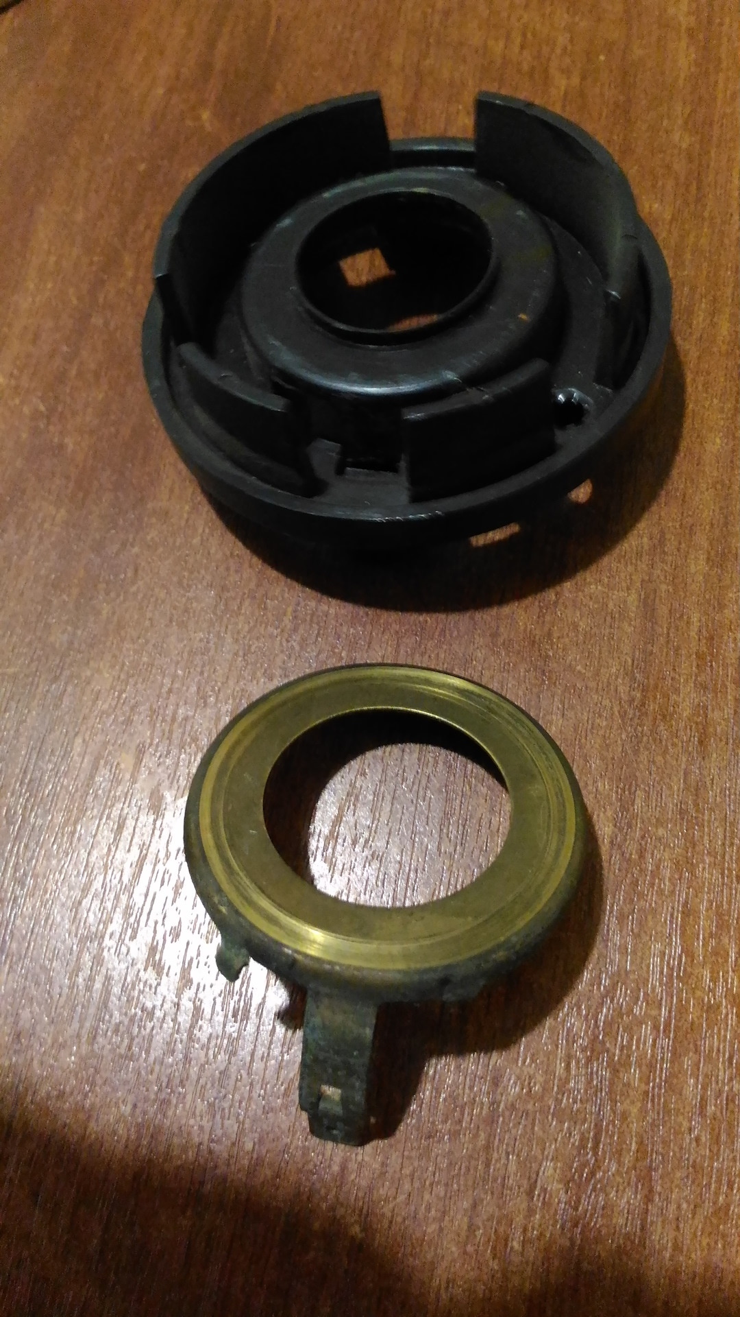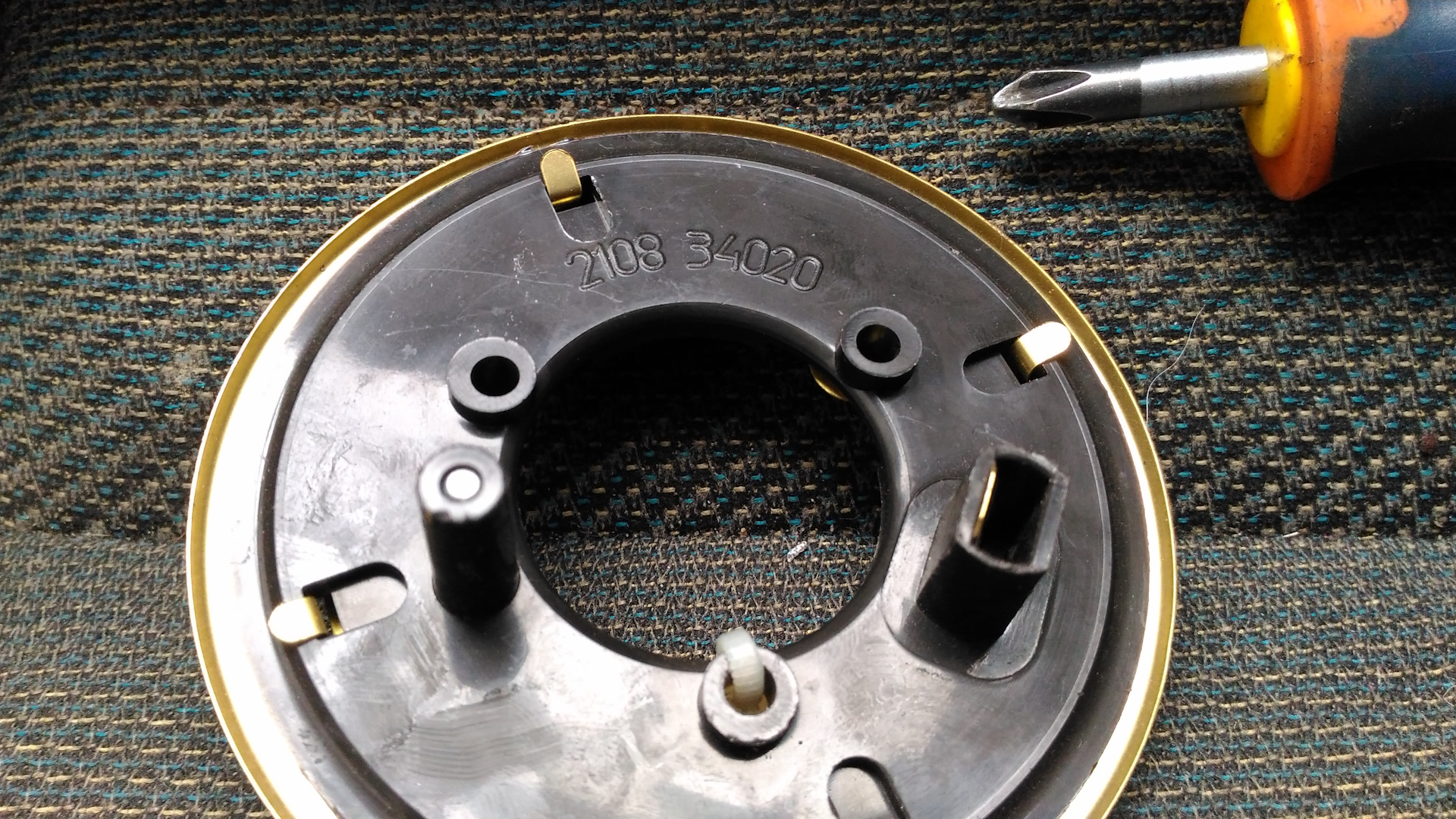 Чтобы подружить руль с новыми подрулевыми нужно немного его доработать. Центральная часть подрулевых будет от ВАЗ 2108, а это значит, что и контактное кольцо на руле нужно от ВАЗ 2108. Откручиваем 3 самореза, вынимаем штатное кольцо, отгибаем усики и отделяем медное кольцо от пластмассовой части. Теперь нужно совместить кольцо 2108 с пластмассовой частью Нивы.