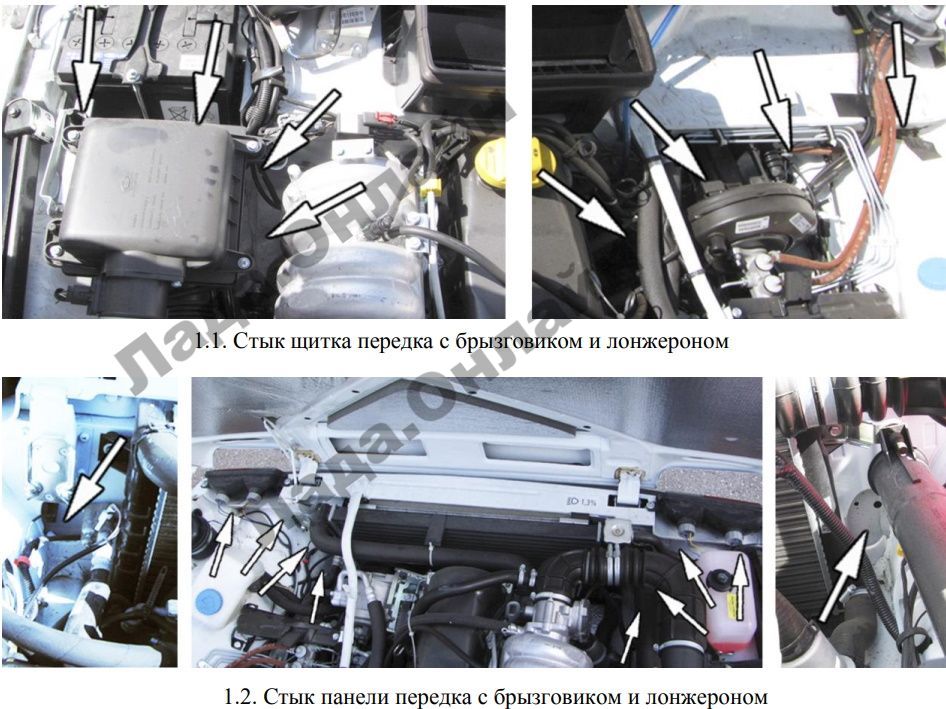 1. Установить автомобиль на рабочий пост (электрогидравлический двухстоечный подъемник типа П-3.2Г), поднять опускные стекла, снять детали, препятствующие доступу в закрытые полости: щиты защитные арок и фартуки грязезащитные передних колес, уплотнители дверей нижние, коврик и обивка багажника (отвертка крестообразная, отвертка плоская, ключ торцовый 8, ключ торцовый 13, ключ Torx T20).