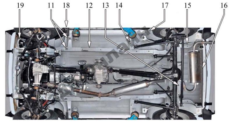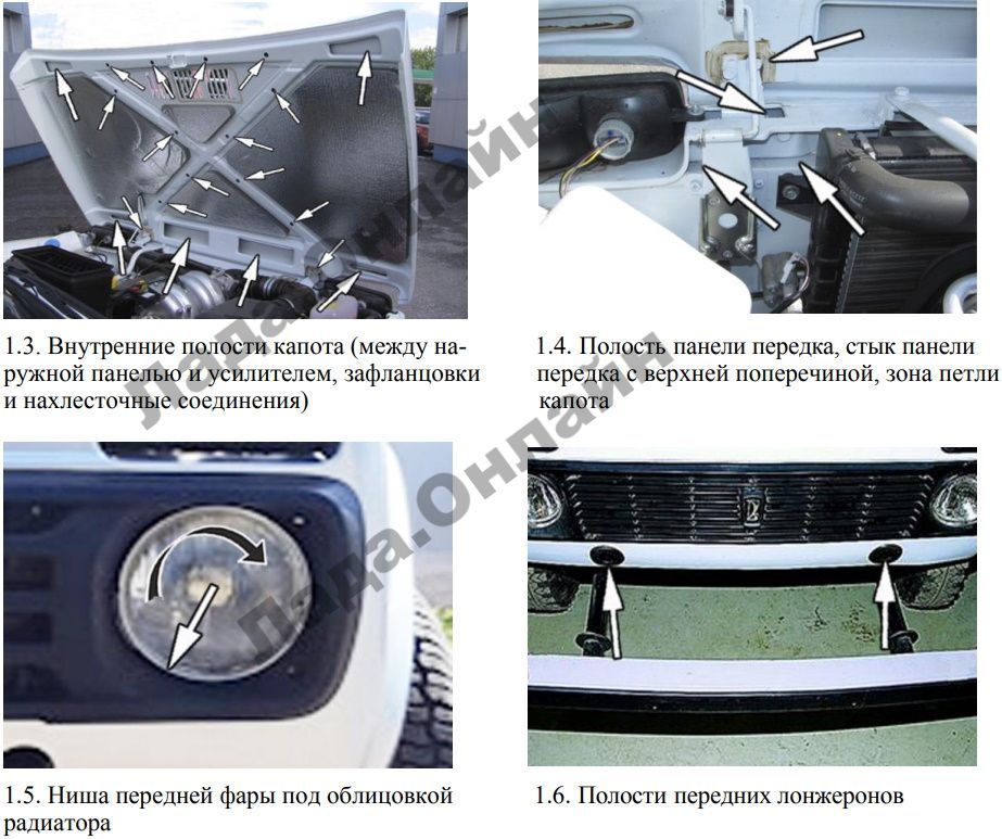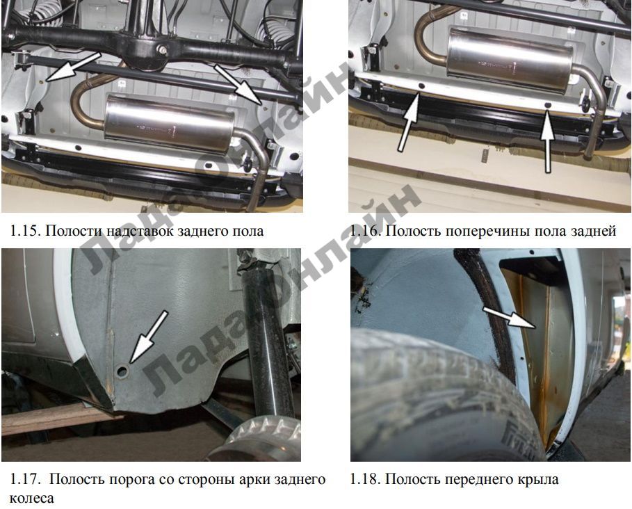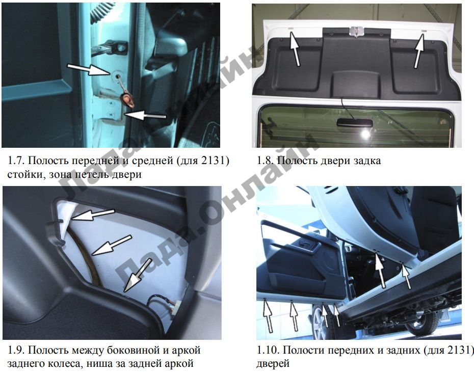Схема нанесения антикоррозионного материала в закрытые полости кузова, днища и арок колес автомобиля LADA 4x4: