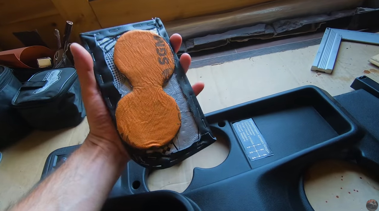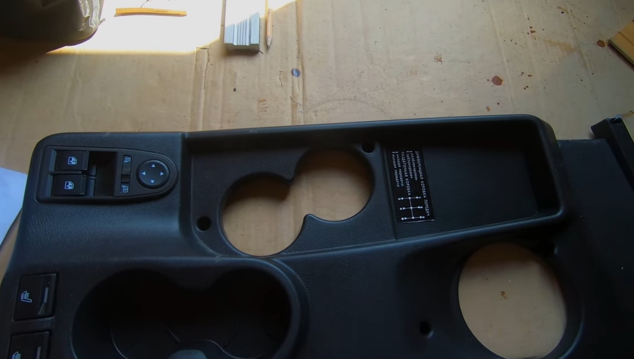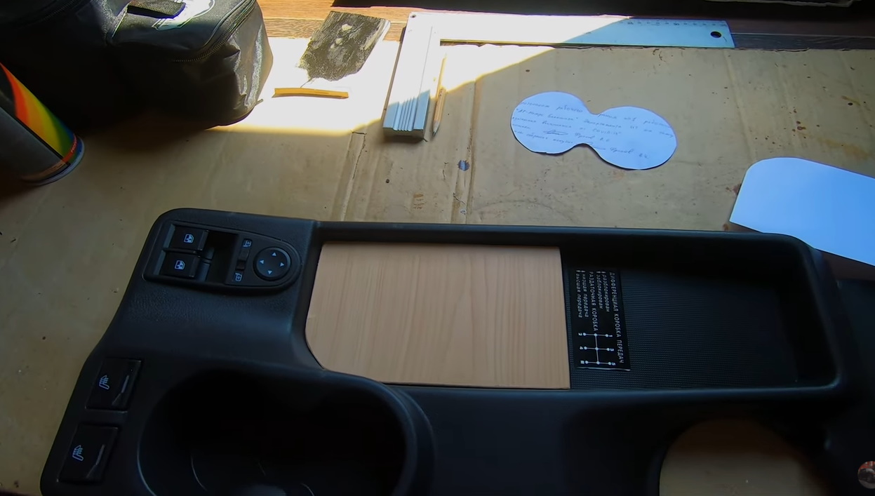 4. Из картона/фанеры изготовить накладку/крышку, которая бы закрывала отверстия рычагов раздатки. На картон укладываем поролон и обтягиваем экокожей. На тыльной стороне накладки наклеиваем куски шумо/виброизоляции круглой формы под отверстия в тоннеле.