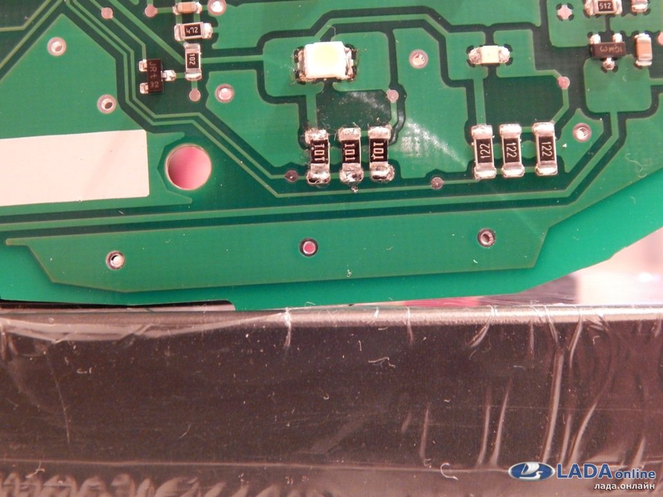 На плате приборной панели предусмотрены места для установки всего необходимого. Припаиваем резисторы и светодиод на места, которые показаны на фото. Не перепутайте полярность светодиода, "Масса" светодиода слева, а "Плюс" с права.
