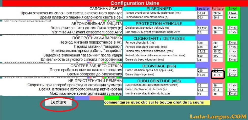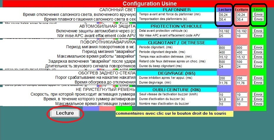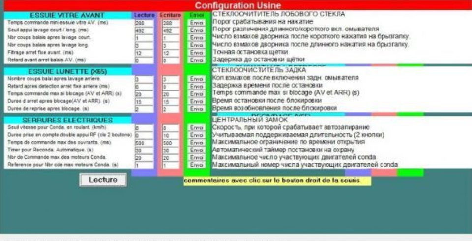 Выбираем вкладку Параметры UCH, нажимаем кнопку Lecture (чтение) и получаем текущие настройки ЦЭБКС. Чтобы изменить данные необходимо в выбранном окне колонки Ecriture (запись) набрать необходимый параметр и нажать соответствующую кнопку в колонке Envoi (отправка).