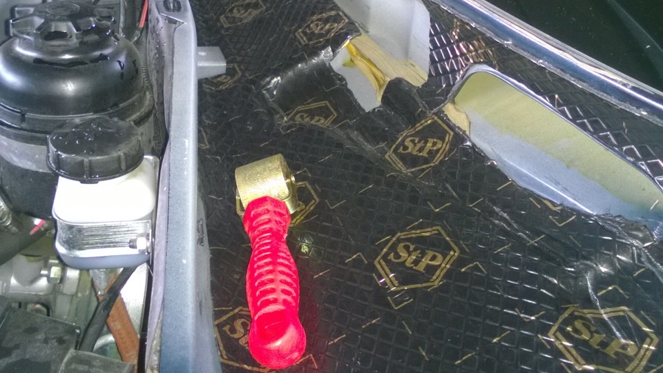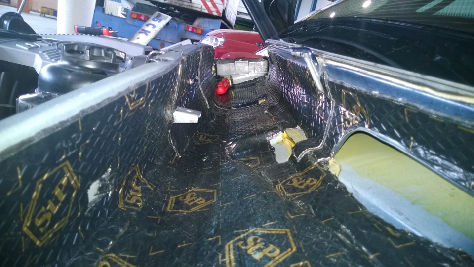 5. Наклеить на кузов виброизолятор. Отрезаем куски подходящих размером, нагреваем техническим феном, укатываем твердым валиком. Заклеиваем почти всю поверхность, оставив технологические отверстия открытыми.