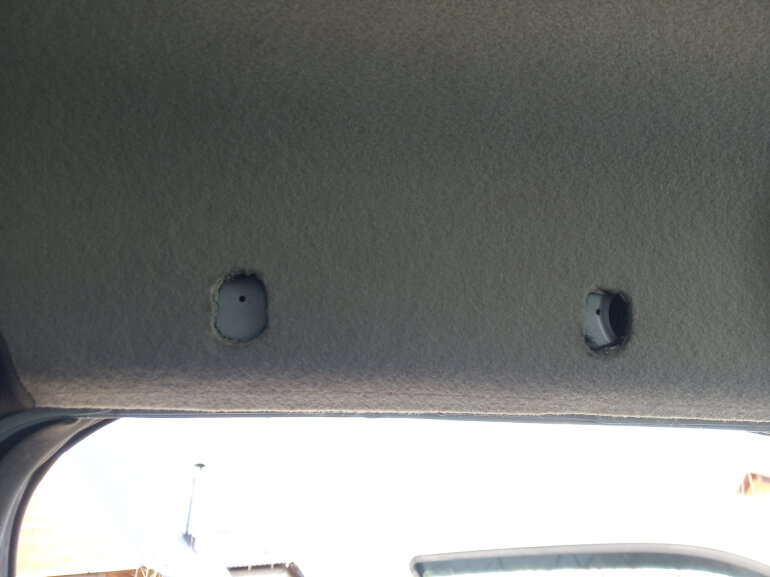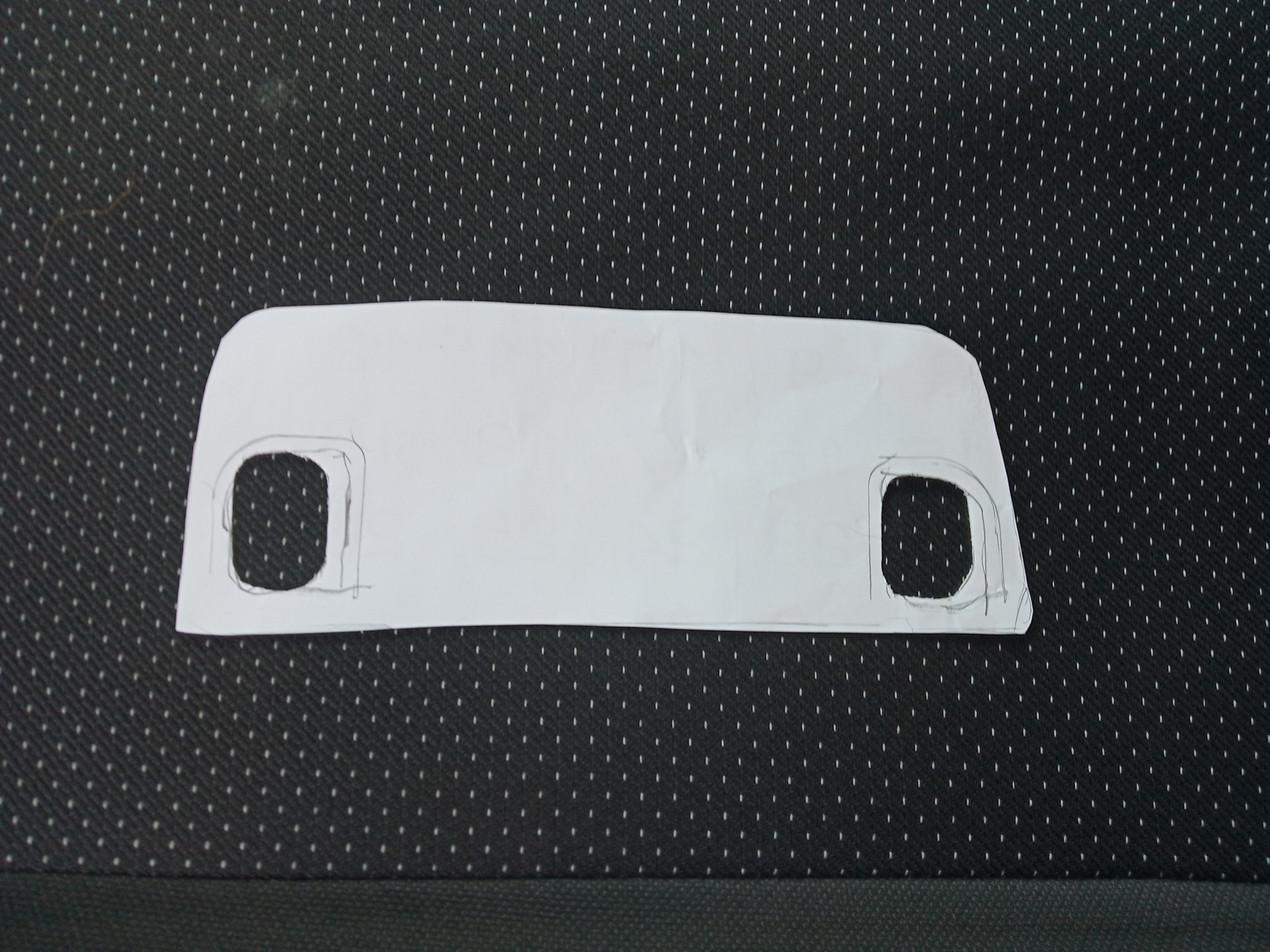 3. Канцелярским ножом сделать отверстия в обивке потолка, используя шаблон.
