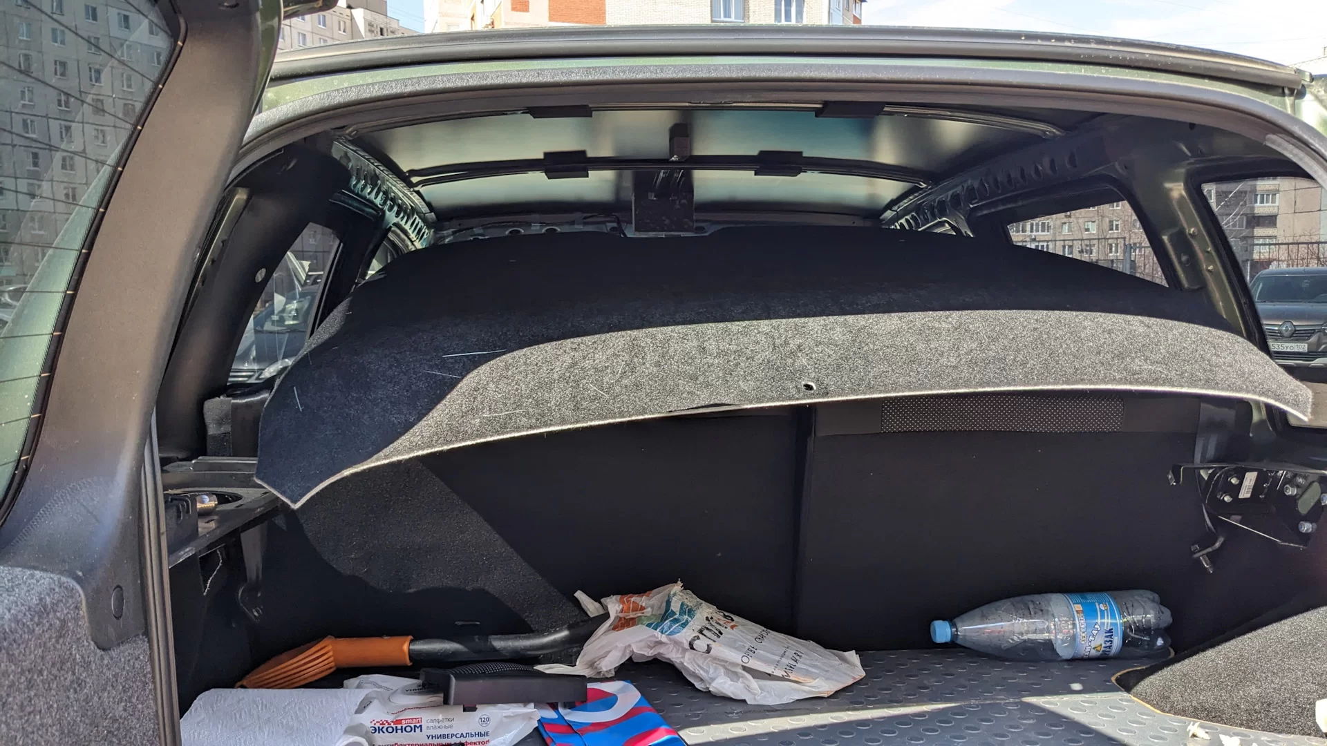 3. Снимаем обивку потолка. Для этого сначала демонтируем солнцезащитные козырьки, потолочный плафон и ручки, а также обивки передних стоек ветрового окна. После этого снимаем обшивки багажника (на которых держится задняя полка). Центральные обивки стоек снимать не обязательно, достаточно только отогнуть верхнюю часть в сторону центра.