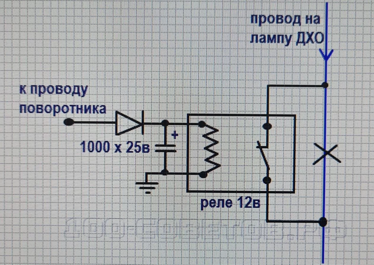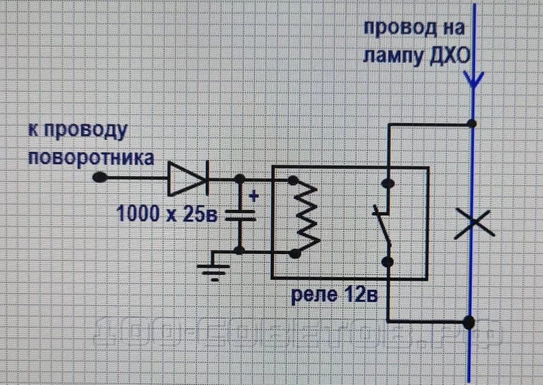 В этой схеме номинал конденсатора подбирается в зависимости от реле. Именно от номинала конденсатора зависит время до выключения реле от последней вспышки поворотника.