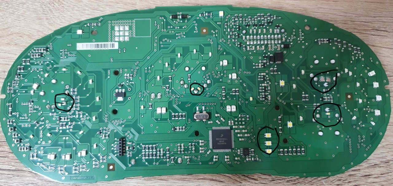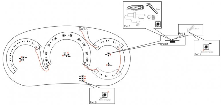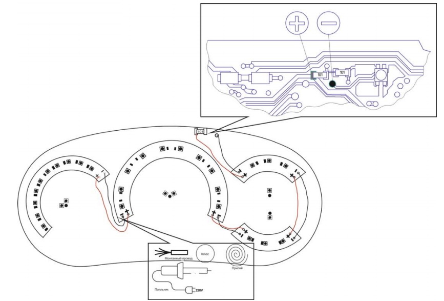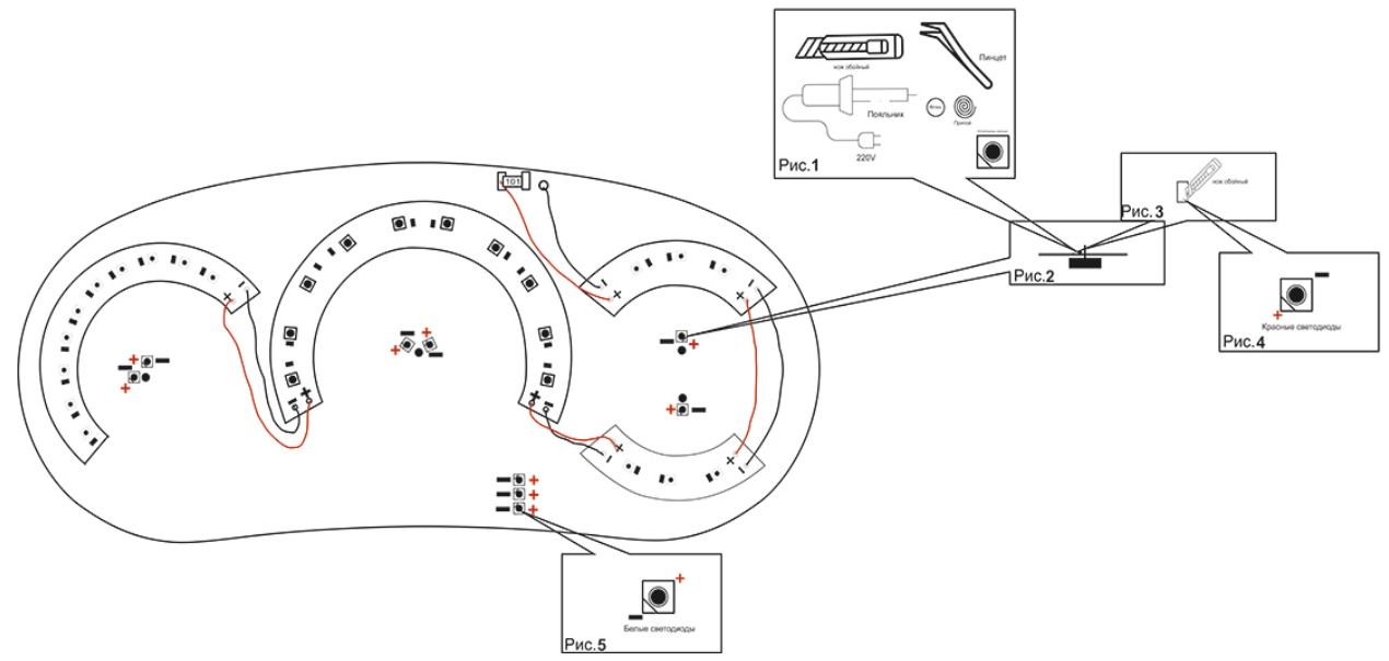 1. Паяльником отпаиваема штатные светодиоды: тахометр 2 шт. спидометр 2 шт. ук. уровня топлива 1 шт. ук. температуры 1 шт.