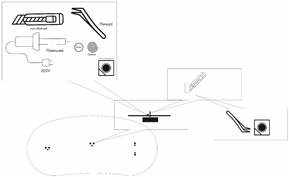 6. После того как площадка под светодиод расчищена, устанавливаем новые светодиоды, используем при этом: паяльник, флюс, припой.