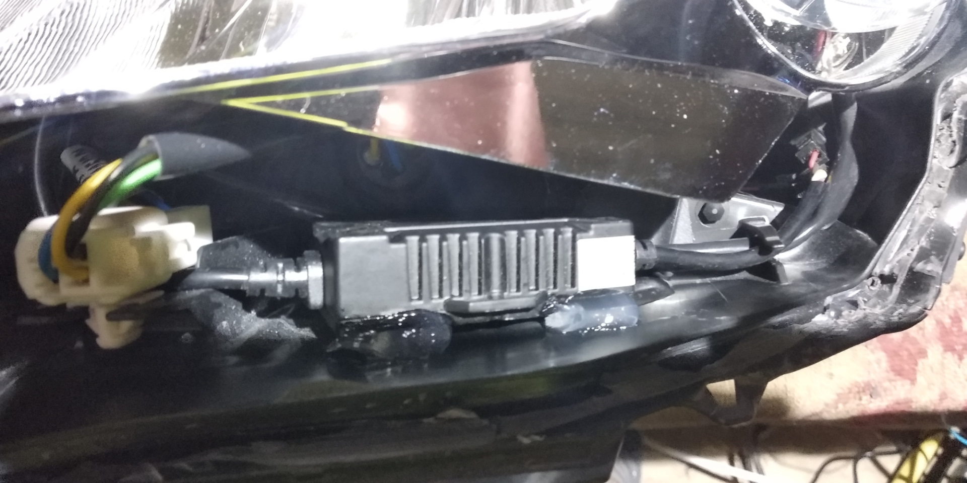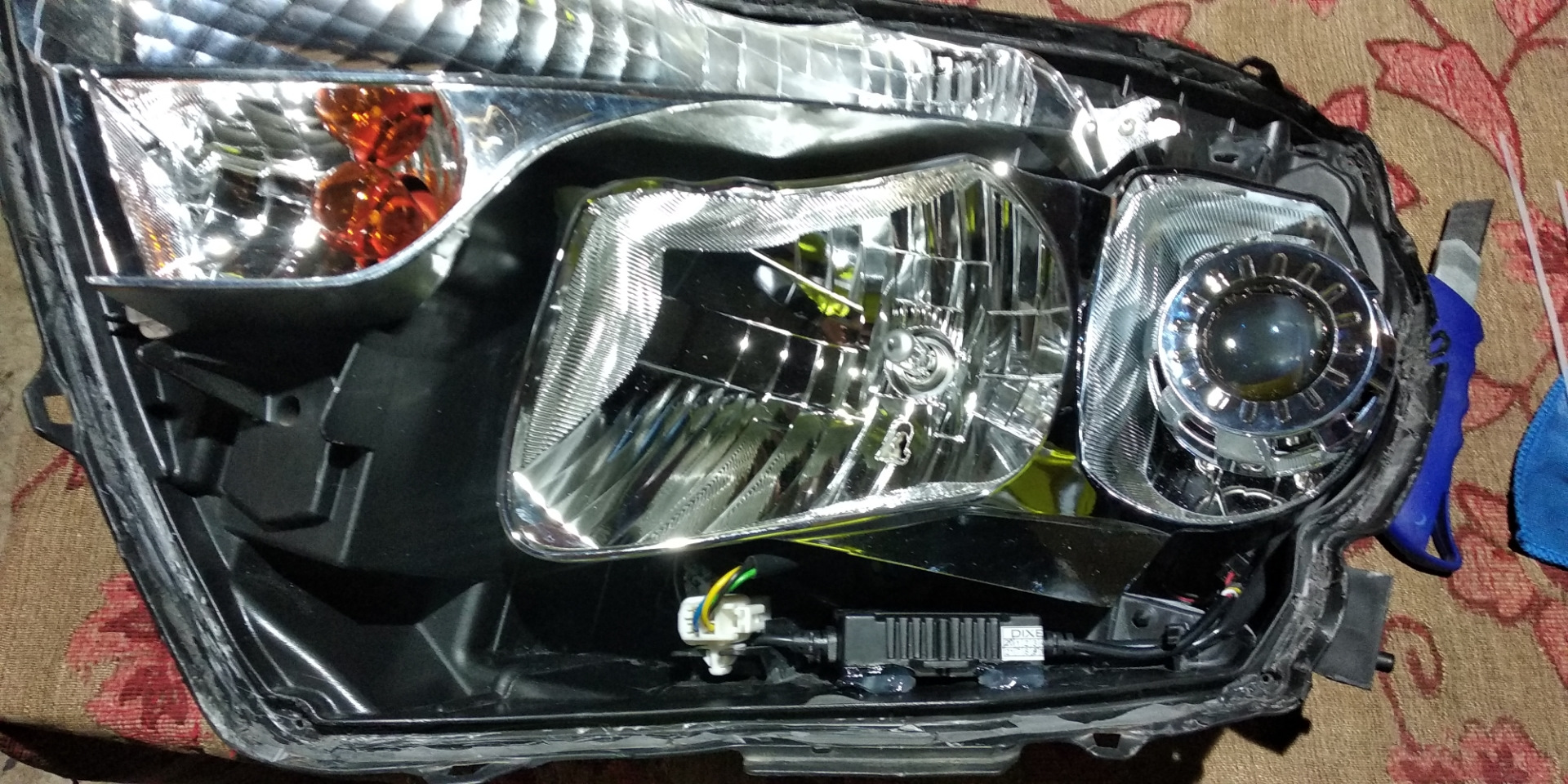 5. Подключить штатный ближний свет и линзу одновременно. Регулируем линзу, выставляем горизонт по штатному ближнему свету фар. Укладываем провода внутри фары, выполняем сборку.