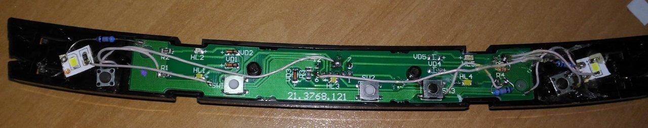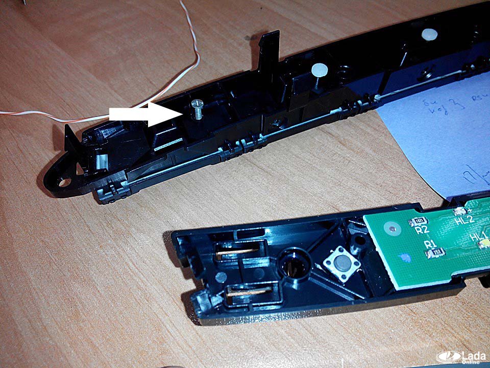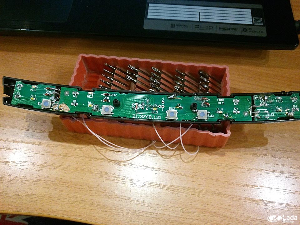 Чтобы разобрать панель кнопок потребуется вывернуть семь винтов крепления (с торца - 3 шт, по краям - 2 шт и под кнопками - 2шт.), и освободить фиксаторы по краям.