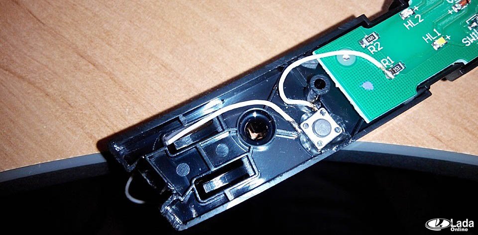 Если решите сделать кнопку ближе к центру, то для тактовой кнопки на плате есть специальное место. Припаиваем ее прямо на контакты, а провода подключаем аналогичным образом (один на массу к плате, другой наружу).
