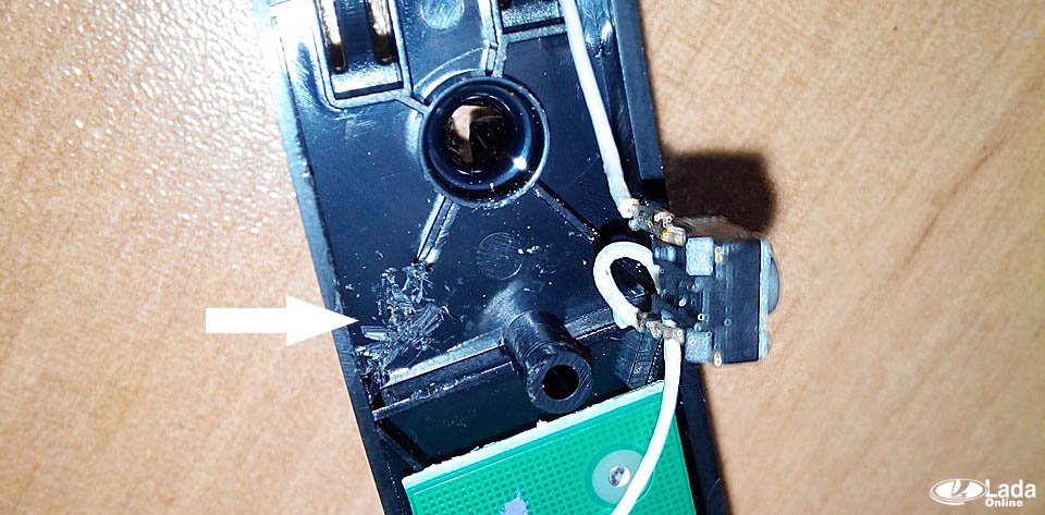 Чтобы у заглушек появился свободный ход, как у кнопки, следует откусить упоры, которые указаны на фото. Роль толкателя будет выполнять болт с пружинкой, который устанавливаем в панель следующим образом:
