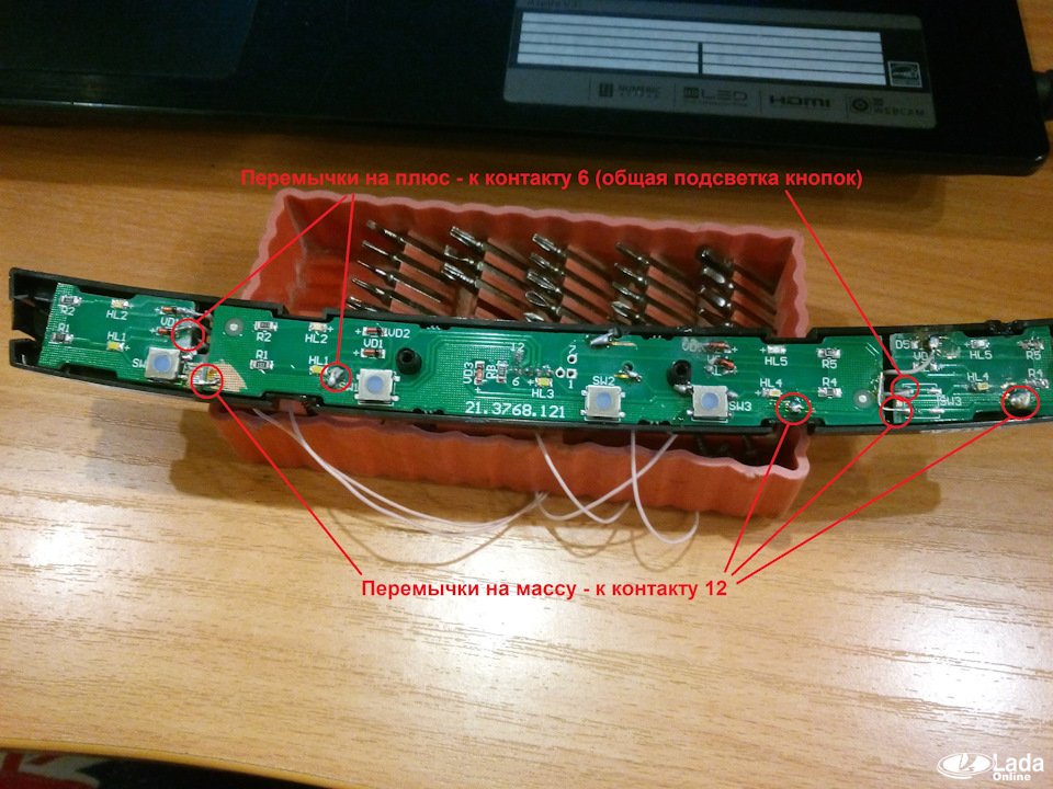 Назначение кнопок может быть каким угодно, например, включение/отключение ПТФ, обогрева лобового стекла, регистратора/радар-детектора или индикацией низкого уровня омывающей жидкости.